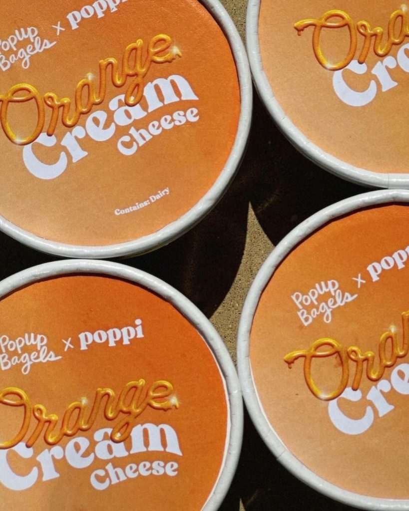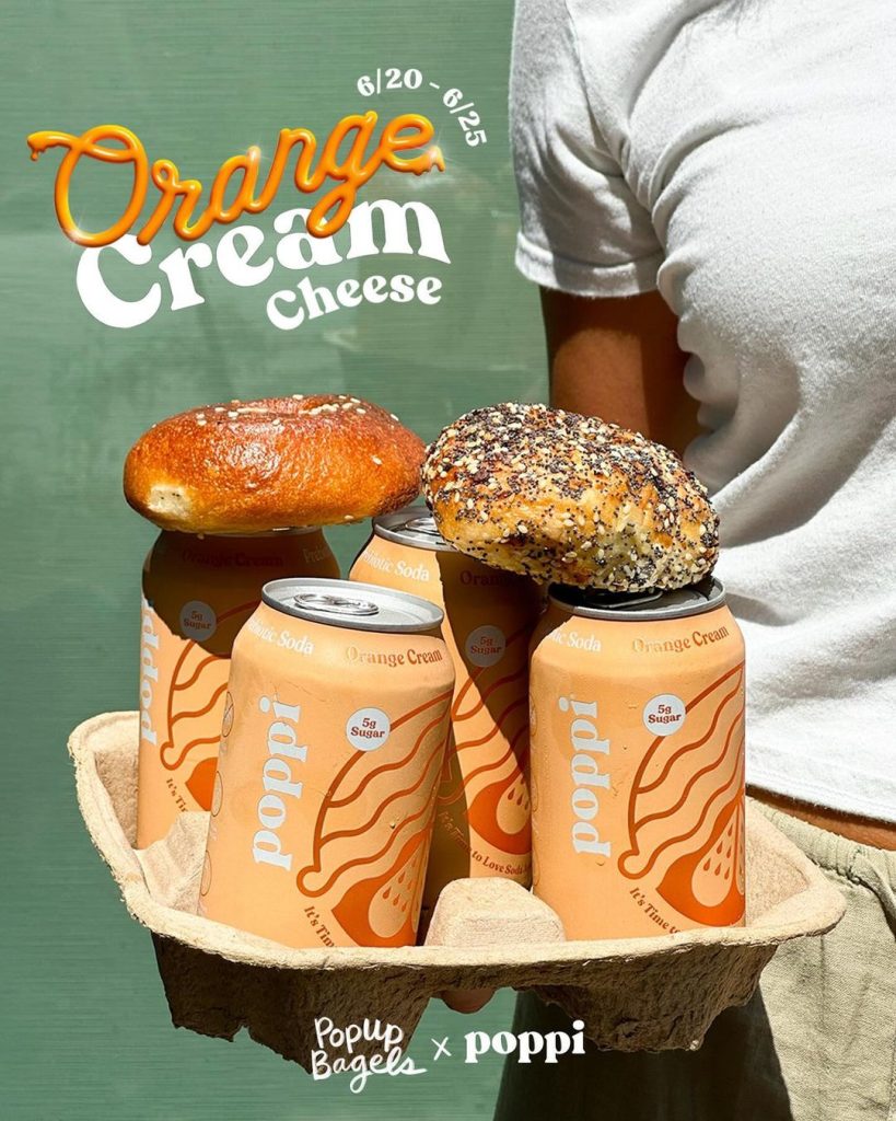 Poppi and PopUp Bagels have teamed up for a limited-edition collaboration that you didn’t know you needed: Poppi Orange Creamsicle-flavored Cream Cheese. The unique brand collaboration brings a fun twist of Orange Cream to the PopUp bagel experience just in time for summer. Poppi’s Orange Cream branding is showcased in vibrant tubs featuring eye-catching 3D cursive typography.