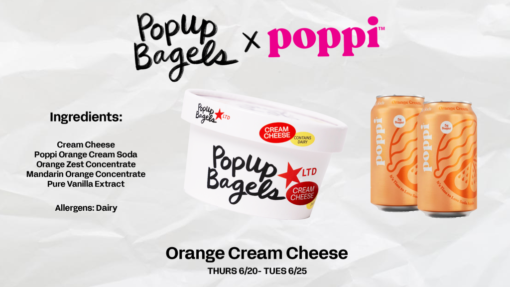 This special edition cream cheese will be available at all PopUp Bagels locations starting this Thursday, 6/20. For more details on this exciting collaboration, visit their Instagram pages: Poppi and PopUp Bagels.