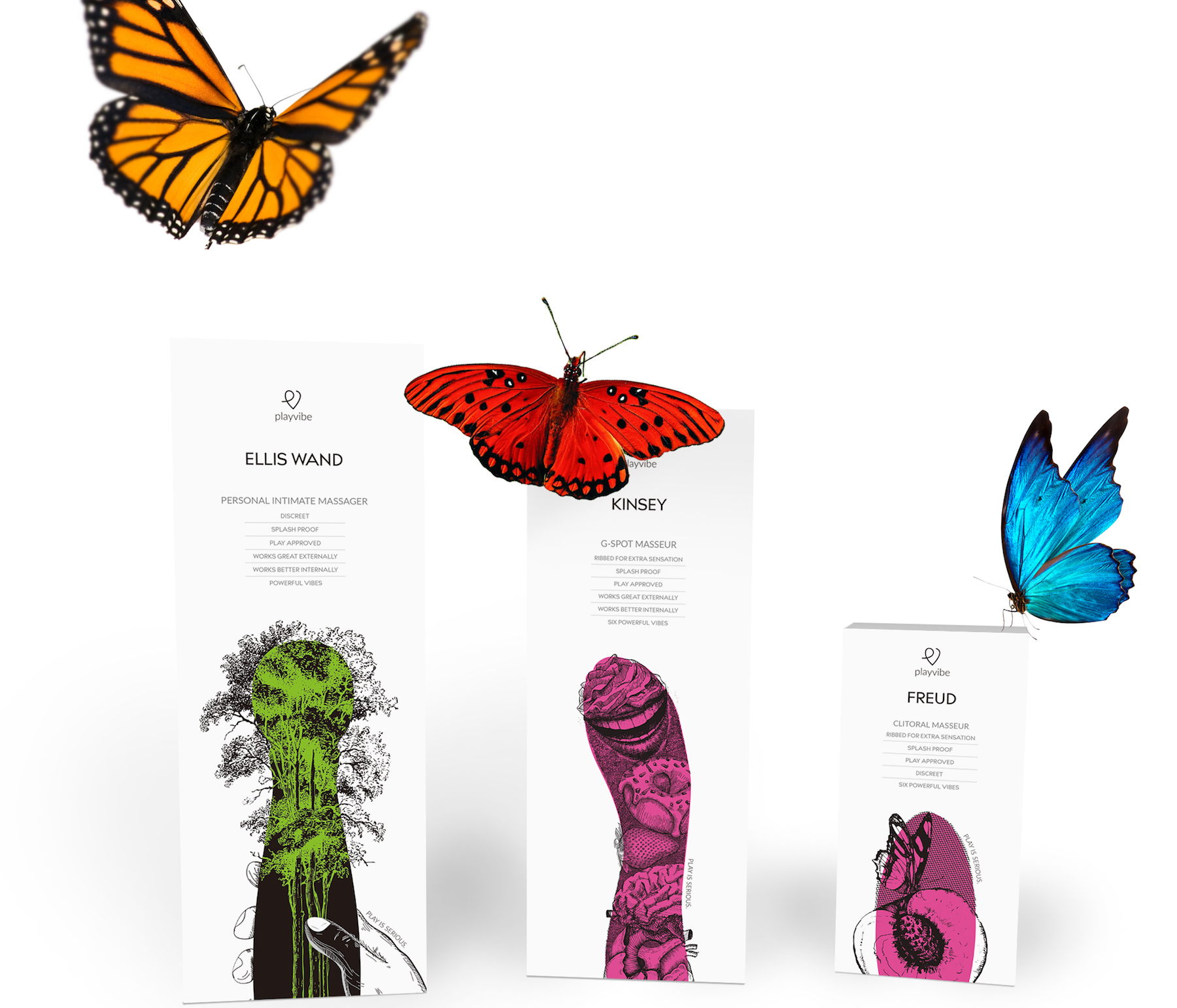 Play Vibe believes that sexual pleasure is simply natural. The packaging, designed by Urszula Krasny, uses flora and fauna to emphasize that sexual wellness is a part of overall health. Elegant illustrations and bold colors express a modern and feminine vibe, and names of each product are a nod to some of history’s pioneers in sexual health.