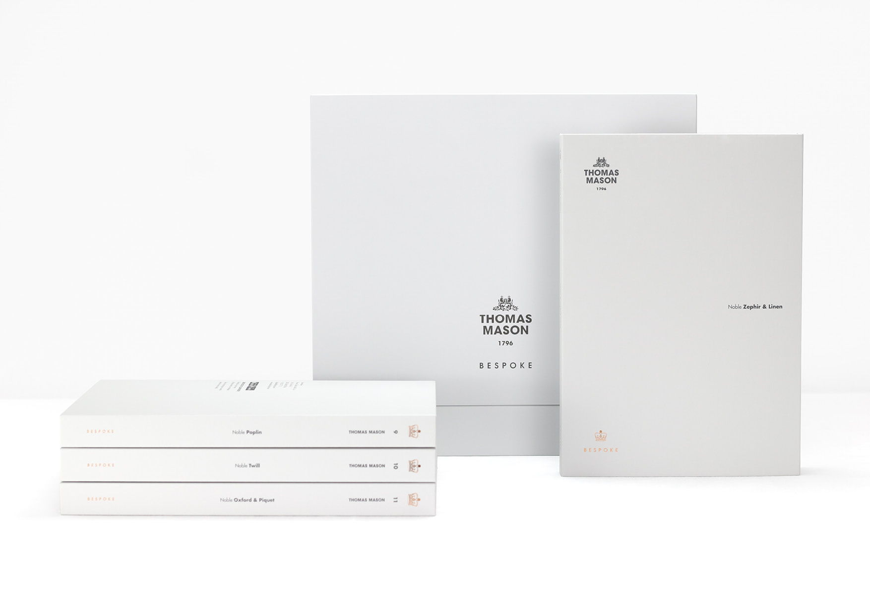 White, Red & Green designed this elegant packaging for BESPOKE, a range of fabrics for Thomas Mason, a high-end brand known for providing only the finest quality fabrics.