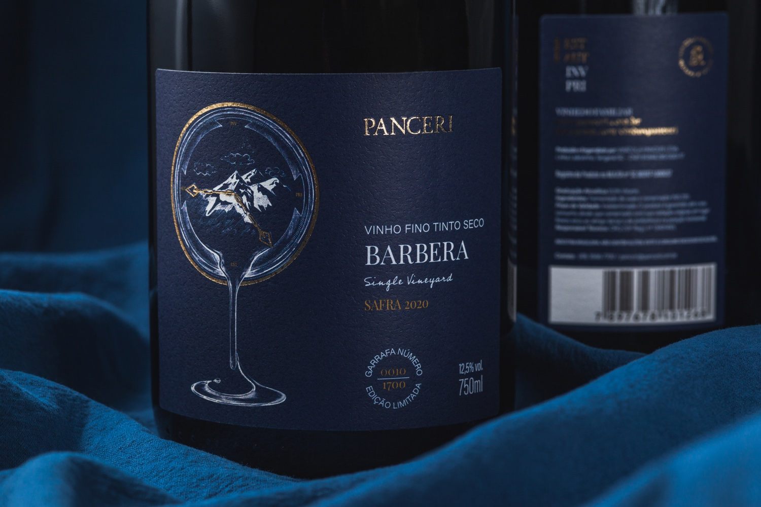 The design of Panceri’s Barbera wine label evokes the passage of time and seasons, crucial to the production of quality wines. The illustration shows a clock and the four seasons – Pri, Est. Aut, Inv in their Italian abbreviations – with mountains in the background. Between summer and autumn, the grapes are harvested and the wine is produced, which flows through the clock, creating the shape of the base of a wine glass.