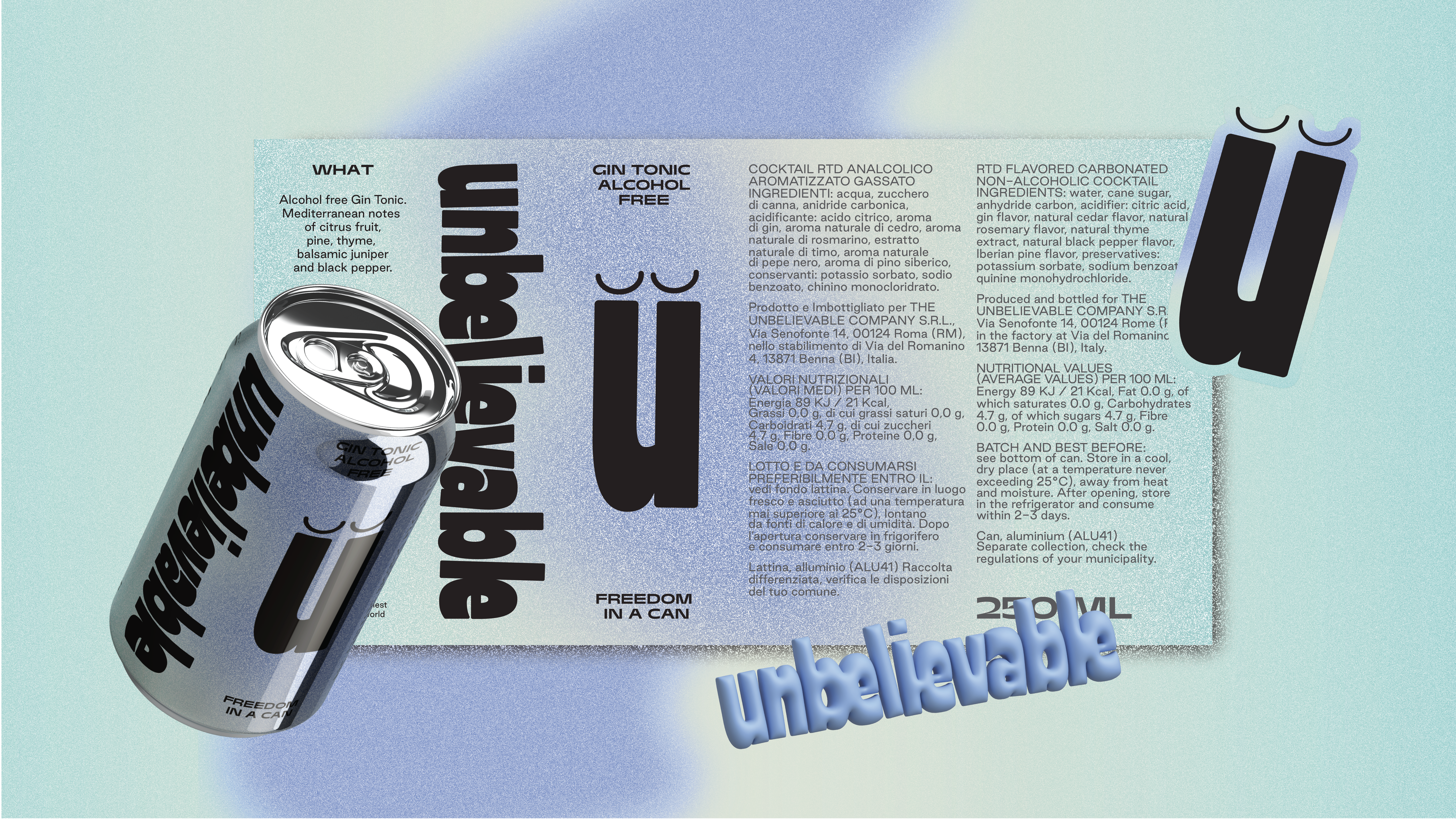 Marta Veludo Studio has more fun than maybe anyone has ever had with the letter “u” in their expansive, charming design for the non-alcoholic drink brand Unbelievable. The can is cool on its own, with sleepy eyes above its “u” logo and a cloudy, airbrushed background, but the type goes wild on the brand’s accompanying system.