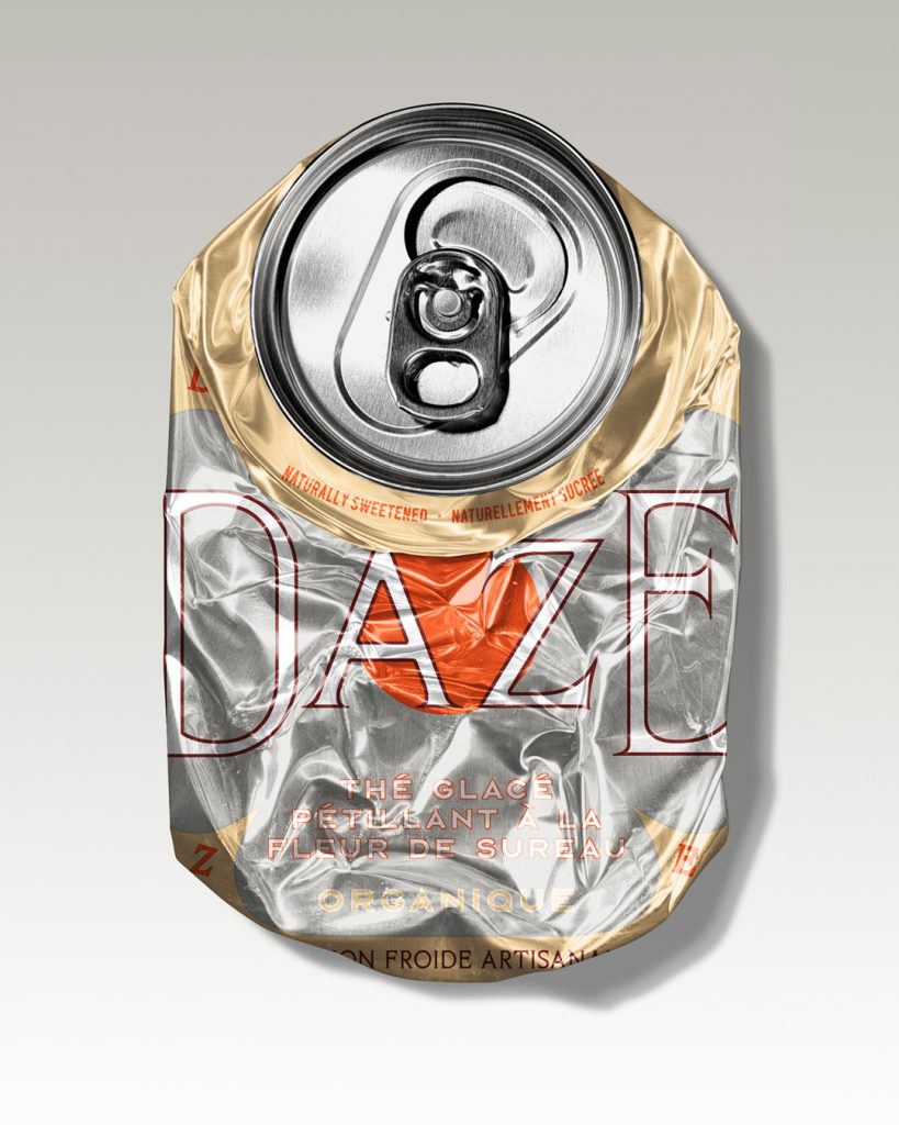 The packaging design for Daze, designed by Amélie Lehoux, features a vintage-inspired aesthetic with a bold serif typeface, giving the brand a classic yet modern feel. The color palette combines the silver aluminum of the can with warm orange and cream accents, evoking a sense of artisanal craftsmanship. The typography nods to traditional branding with a twist, creating an approachable identity with a playful undertone.