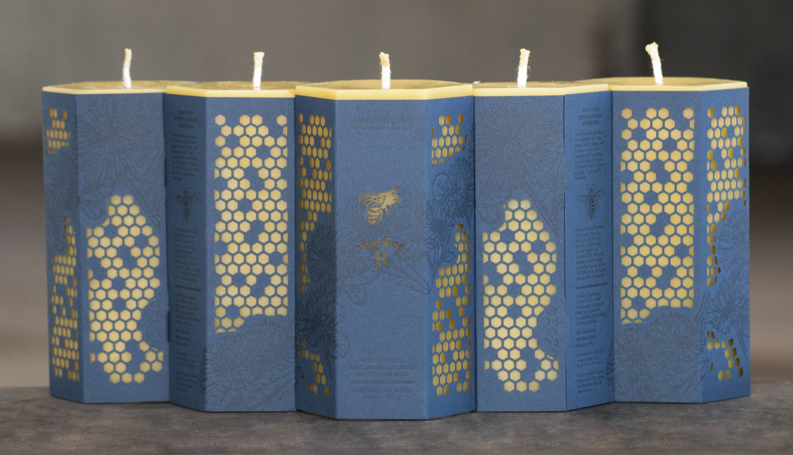 Angel Bomb completed the design for Worker B Candles featuring a beautiful laser cut honeycomb pattern.