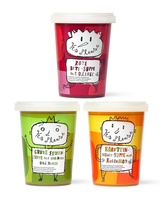 “The objective: To create a new brand of wholesome, fresh, chilled soups for Germany, where there is currently no such commercial product in the market. The concept: The Yes Please brand name supported by ‘filling you with happiness’ and ‘good food for busy people’ straplines. The identity uses hand-drawn character illustrations, typography and emotive language to communicate the comforting appeal and ‘yumminess’ of the product. The market for the soups was German men and women over 30 who have busy lives, particularly working mothers.”